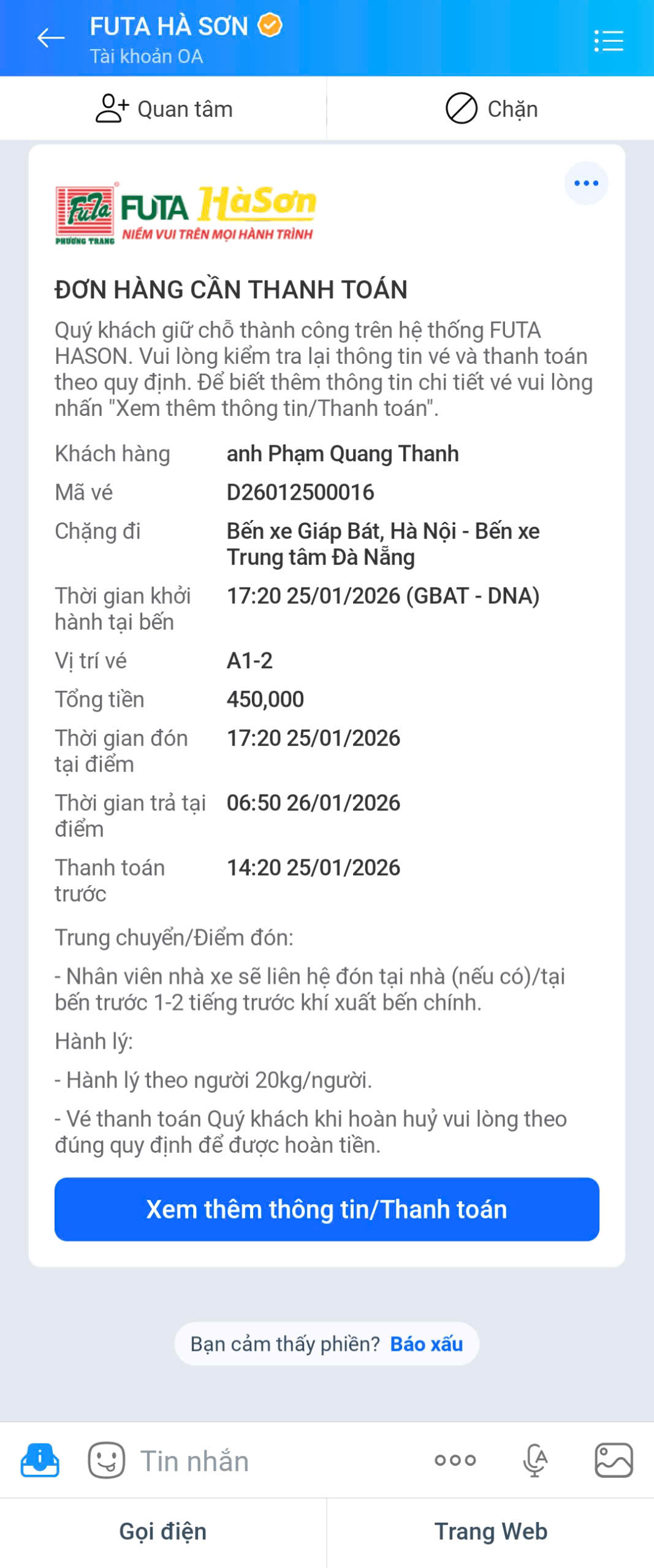 Bước 5: Futa Hà Sơn gửi email/zalo xác thực hoàn tất thanh toán cho khách hàng.